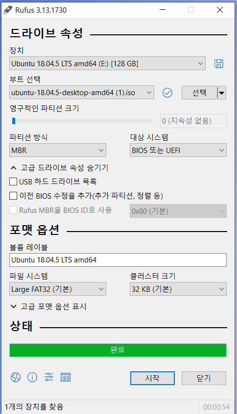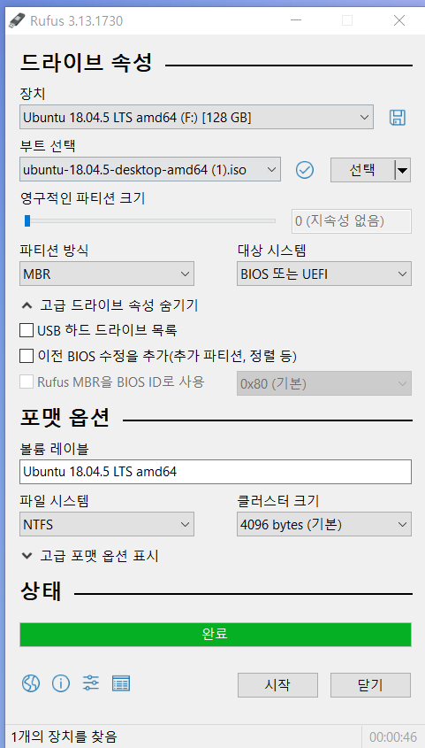 부트선택- 옆에 "선택"클릭하고 아까 위에 1.에서 설치한 "우분투 18.04 이미지 파일"을 찾아서 선택하고,