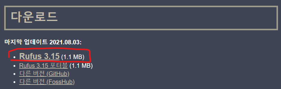 아무튼 iso 파일을 다운로드받았으면, 그다음으로는 iso파일을 리눅스 설치용 usb에 구워줄 프로그램을 다운로드 받아야 한다. 필자는 rufus 라는 프로그램을 이용했다.