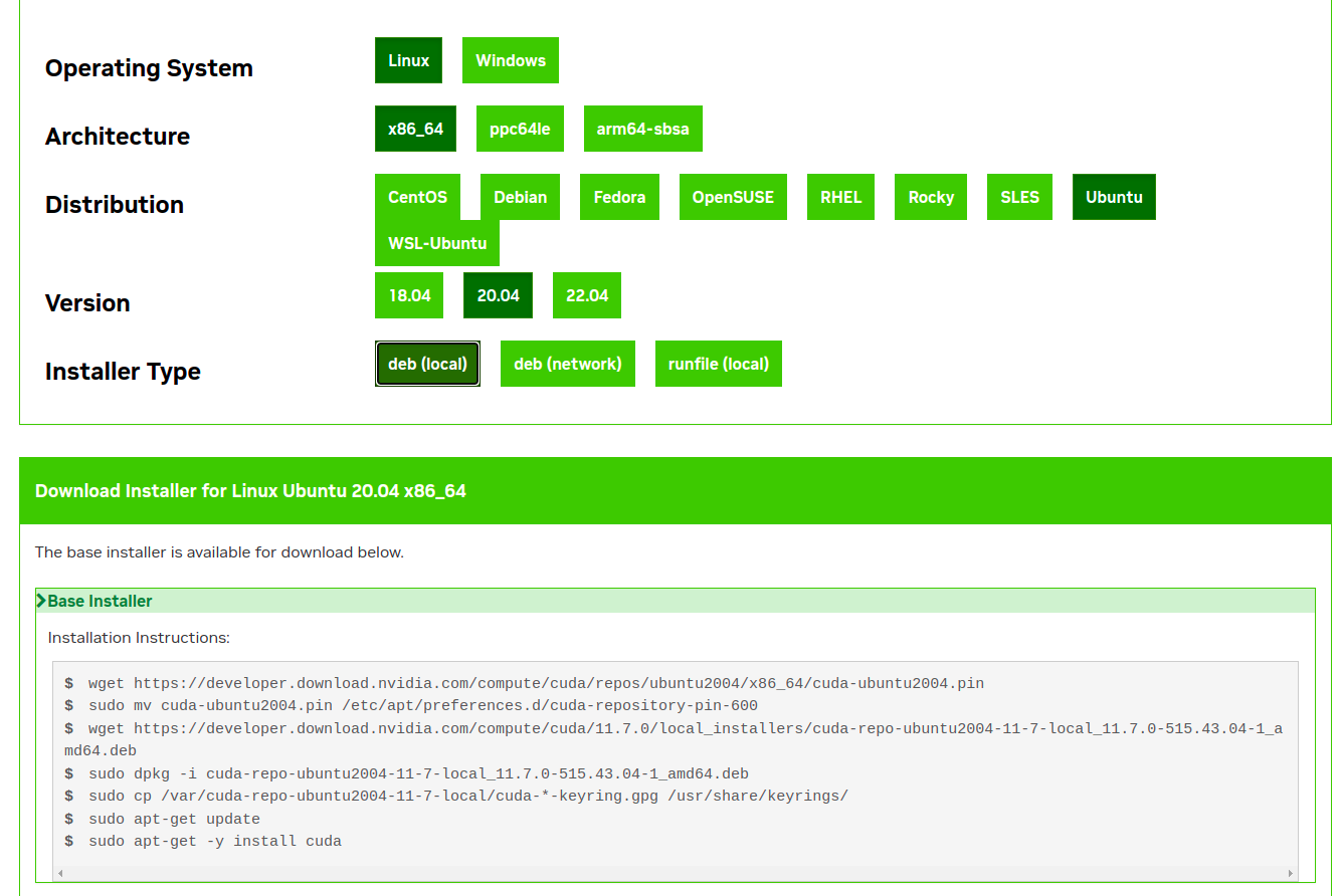 2. 현재 자기 상황에 맞게 선택한다. (필자는 Linux, x86_64, Ubuntu, 20.04, deb(local 파일로 설치하는 방식) 을 선택했다.)