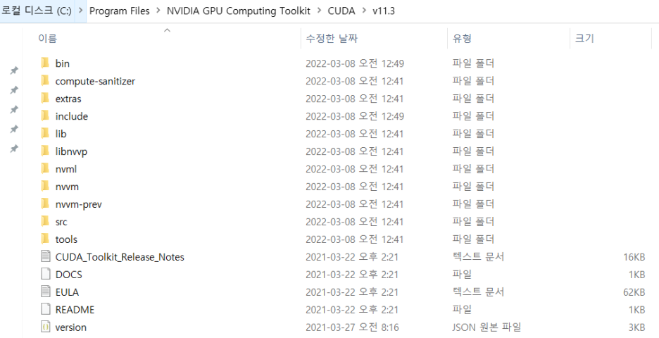 필자 같은 경우에는, C:\Program Files\NVIDIA GPU Computing Toolkit\CUDA\v11.3 폴더 안에, 다음과 같이 먼저 설치했던 CUDA 관련 파일들이 들어있었다.