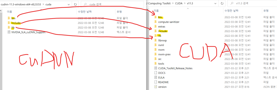 이제, cuDNN 다운받아서 압축풀었던 폴더안의 bin, include, lib 폴더들을 복사해서, CUDA 폴더안에 붙여넣기를 하면, 덮어쓸수 있다.
