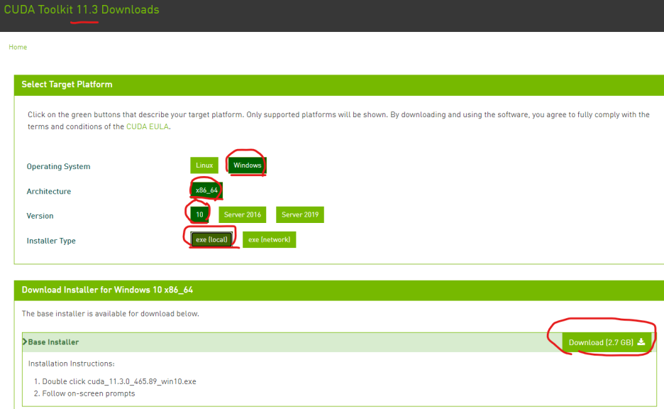 여기서 필자는 CUDA 11.3.0 , cuDNN v8.2.0 으로 설치했다.