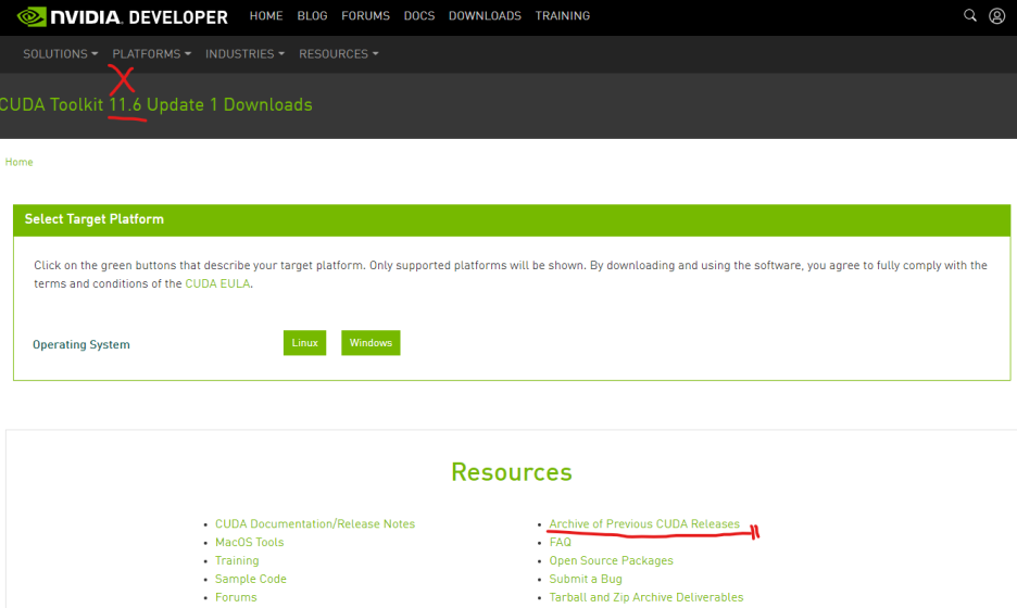 아마 가장 최신 CUDA 버전으로 설치하도록 화면이 나올 것이다. 그런데, 이거 그대로 설치하면, CUDA11.6으로는 현재시점에선 파이토치를 사용할 수가 없다.(현재시점:2022년3월8일) 그래서 아래 오른쪽에 보면, Archive of Previous CUDA Release 를 클릭한다.