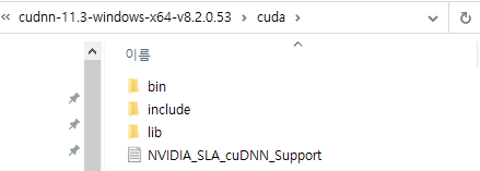 그 안에 보면, bin , include, lib 폴더들이 있다. 이제 이 폴더들을 CUDA 가 설치된 위치에 같이 덮어쓰면서 넣어주어야 한다.