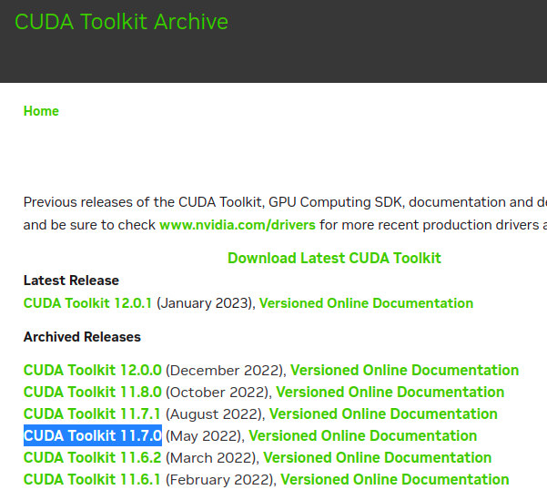 1. 설치할 CUDA 버전을 클릭한다. (필자는 CUDA Toolkit 11.7.0 을 클릭함.)