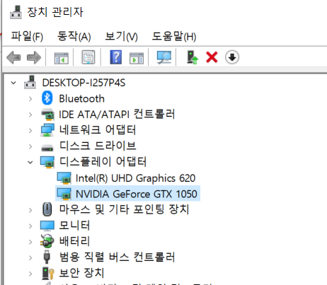 필자는 위와 같이 NVIDIA GeForce GTX 1050 이라는 그래픽카드가 설치되어 있었다.
