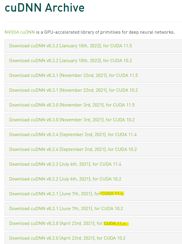 필자는 CUDA 11.3 을 설치했다. 위에 11.x 라고 표시된 두개 중 하나를 선택하면 되었다. 즉, cuDNN v8.2.1 또는 cuDNN v8.2.0을 선택하면 된다. 필자는 cuDNN v8.2.0 을 선택했다.