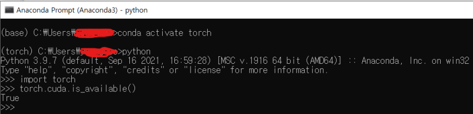 $ conda create -n torch python=3.9 를 실행해서, torch 용으로 torch 라는 이름의 conda 가상환경을 만들어준다. (파이썬은 그냥 비교적 최신인 3.9 로 설치했다.)