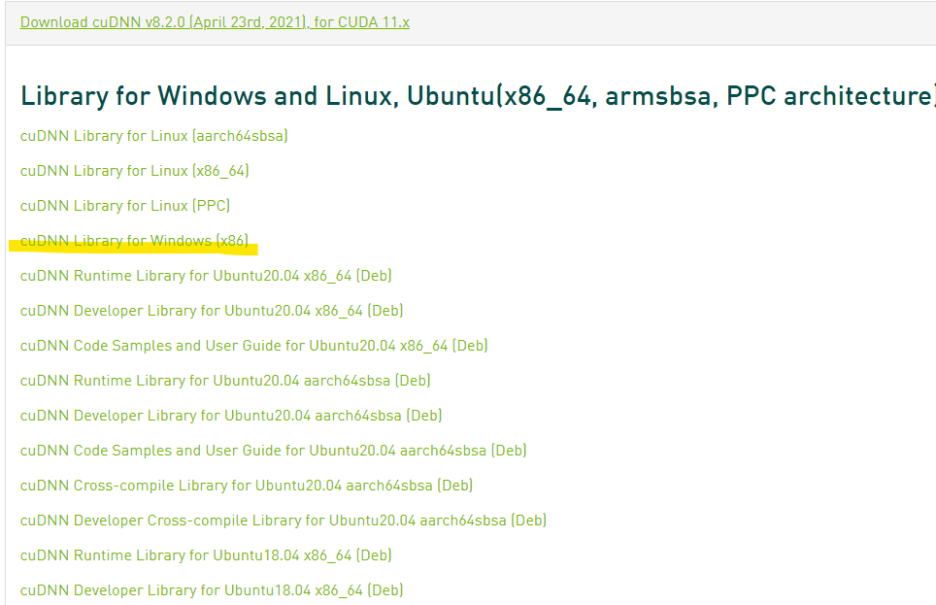 필자는 윈도우10 환경이었으므로, 위 사진과 같이 cuDNN Library for Windows [x86] 를 클릭했다.